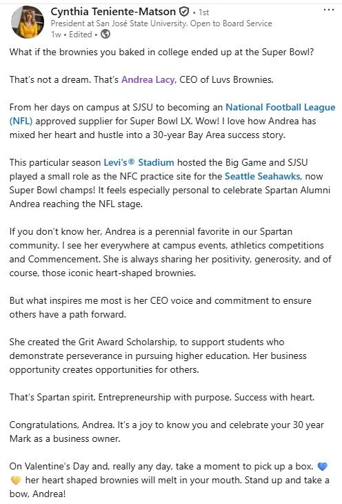 I am honored to share these words from Dr. Cynthia Teniente-Matson, President of San Jose State University, recognizing my journey from campus baker to NFL-approved supplier for Super Bowl LX.